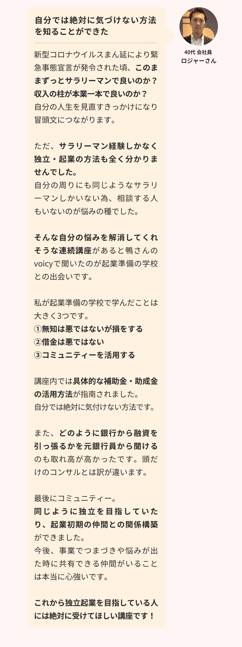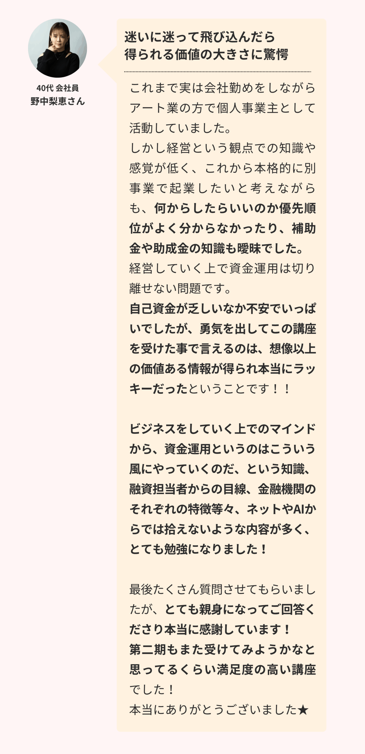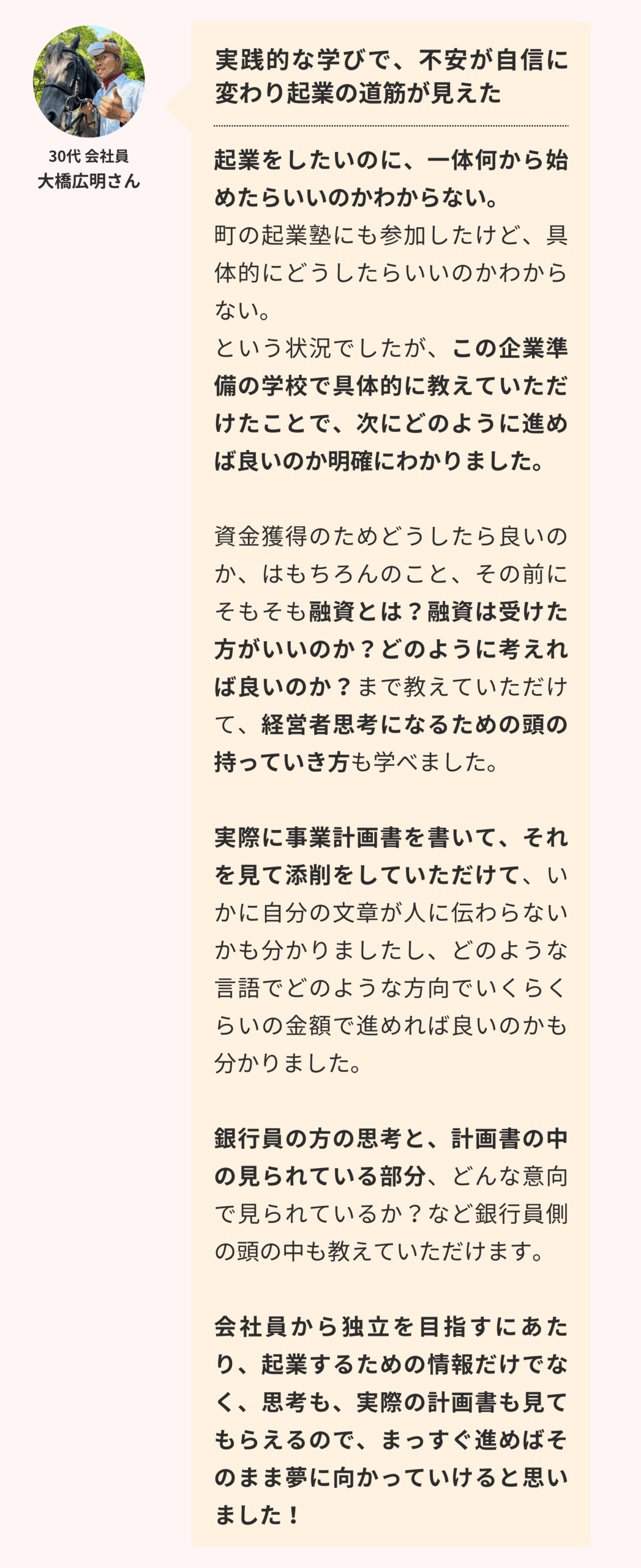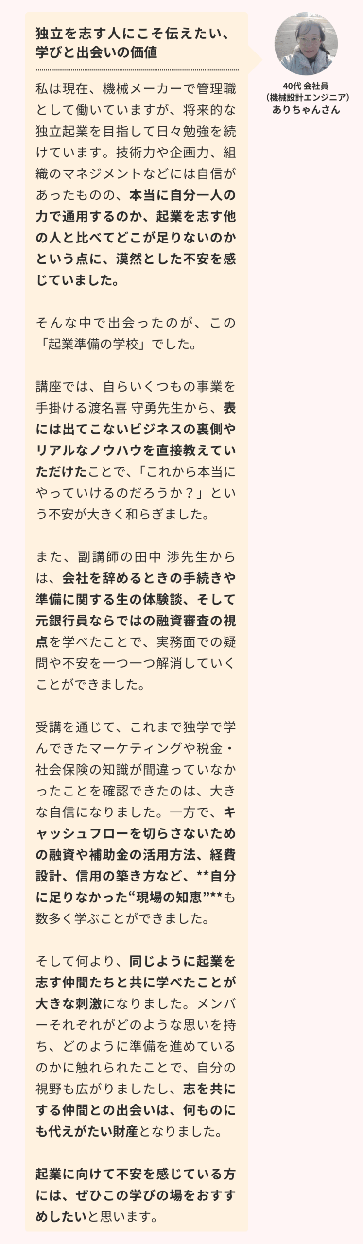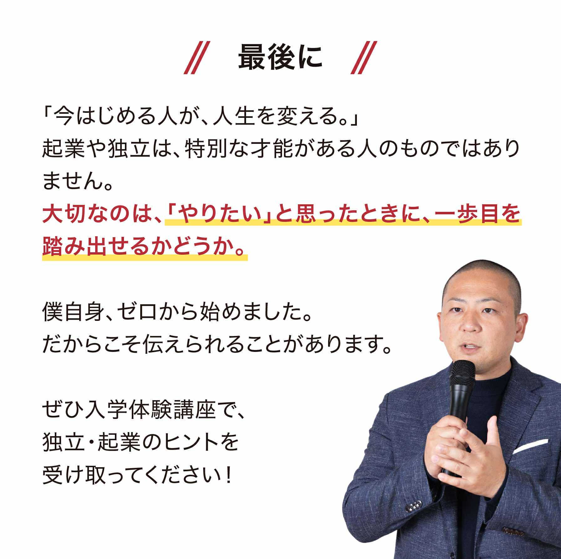 元高校教師から起業し、6年目の現在では5つの法人を経営。鴨さんとW講師を務める「人と金 経営塾」や、沖縄の起業家コミュニティーで主宰もしながら、経営者や創業希望者のサポートをしています。その中でよく聞くのは「経営者やフリーランスとして自分の力を試したい」「でも、会社を辞めた後が不安」という悩み。挑戦の一歩を踏み出せない方や、挑戦を始める時期を探っている方は多くいらっしゃいます。そんな方のために独立前後の不安を無くし、自信を持って挑戦できるよう「起業準備の学校」を開講します。